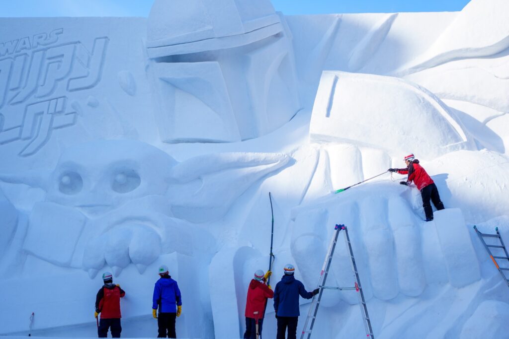 こちらの大雪像はちょうど手入れの最中。梯子をかけ、丁寧に作業されておりました。人が入ると大きさが伝わる写真になりますね。・・・やっぱり、でかい。