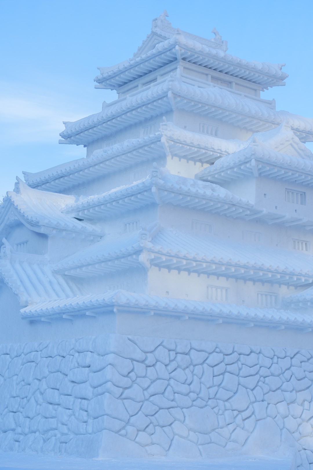 一枚目は、陸上自衛隊第18普通科連隊による”会津鶴ヶ城”。幅21m、高さ15m、奥行き21mもある上に、石垣から瓦まで素晴らしいディテールです。延べ3800人の隊員さんが30日間かけて作成したそうです。昨今本業も忙しい中、美しい雪像をありがとうございます。