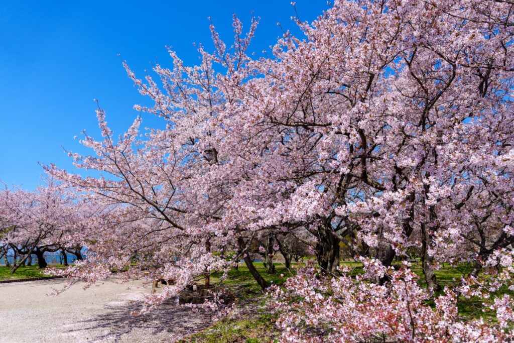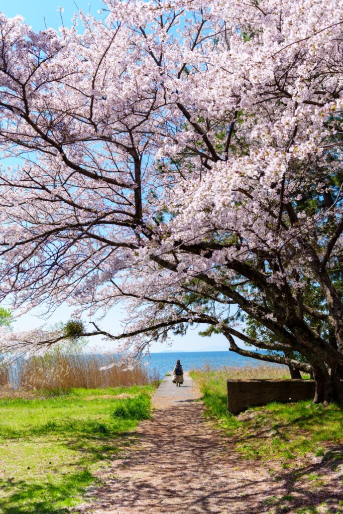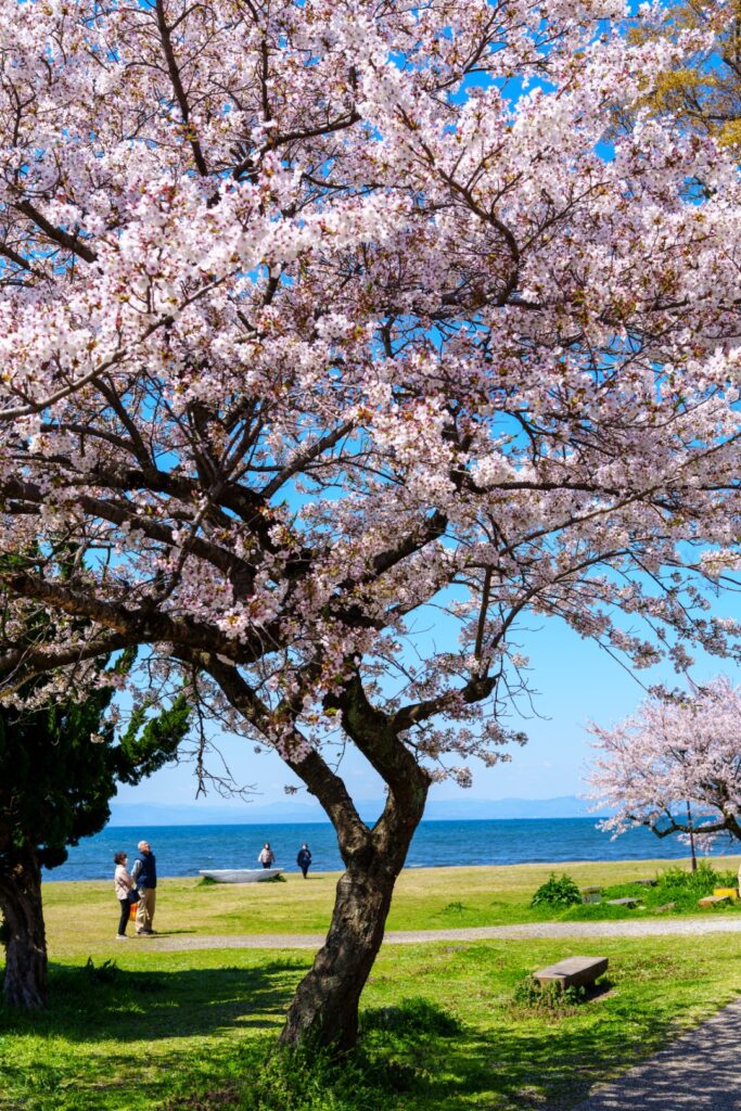 手前にピンクの桜、奥に海のように広く青い琵琶湖の景色が印象的でした。