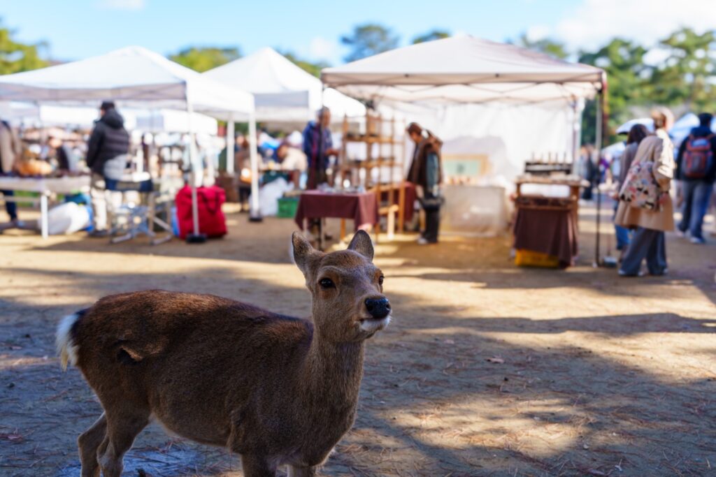 浮見堂からぐるっと回って登大路園地に着きました。陶器市、国際色豊かにたくさんの人とたくさんの陶器で盛り上がっておりました。鹿さんも参加しちゃうのが奈良公園開催らしい景色です。