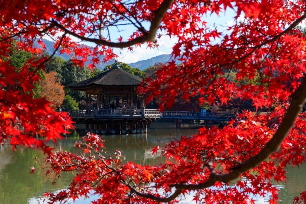 さて浮見堂に着きました。多くのもみじは見ごろを過ぎていましたが、一本の一部だけ良い状態で残っていてくれました。ありがたや。