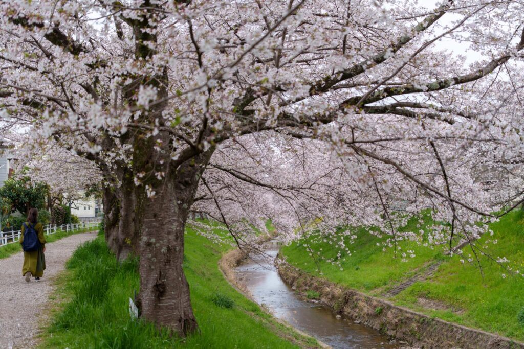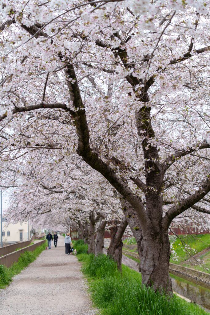 しっかり満開ですね。ゆったり川沿いを散歩。わんこも散歩。