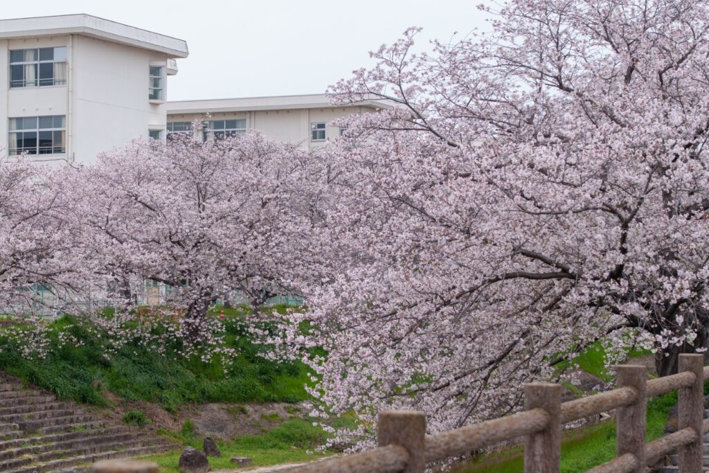 学校と桜。