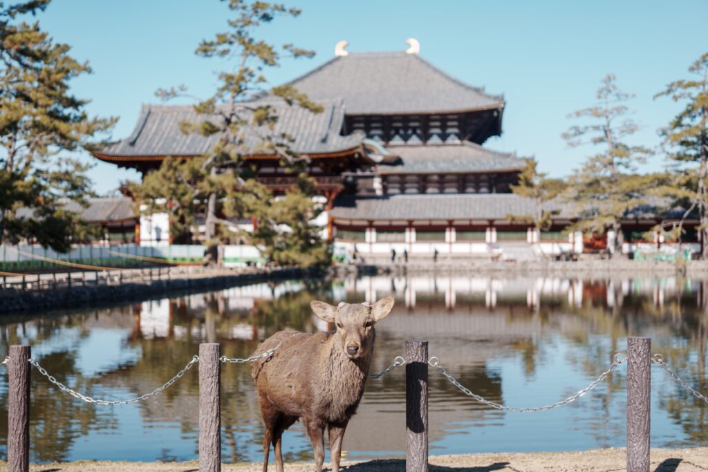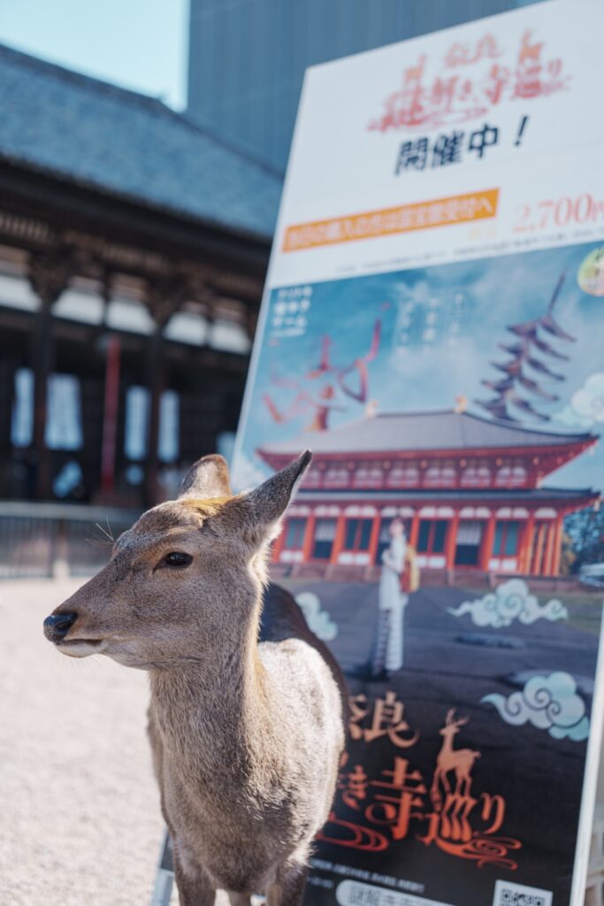 こちらの牡鹿は大仏殿前の撮影スポットで観光客の方を待っており、人気を博しておりました。「記念に一緒に写真撮ろうぜ。安心しな、無料だぜ。」と。