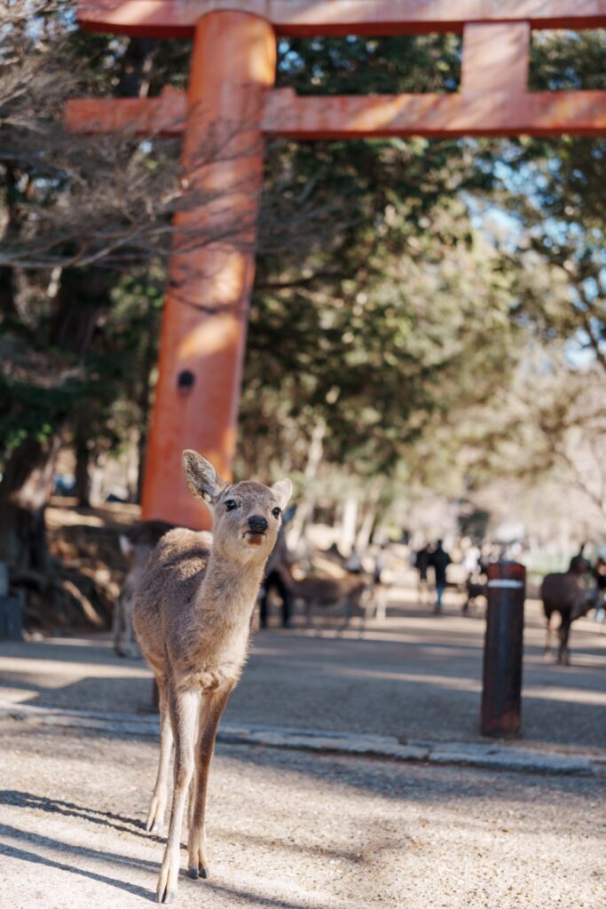 手向山八幡宮の鳥居まで来ました。小鹿が多いですね。癒されます。