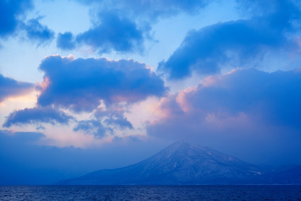 氷濤まつりの会場前に着くと、支笏湖を挟んで雪化粧した恵庭岳と夕焼けの景色。いやー、来てよかったです。風が強くてさむーい。