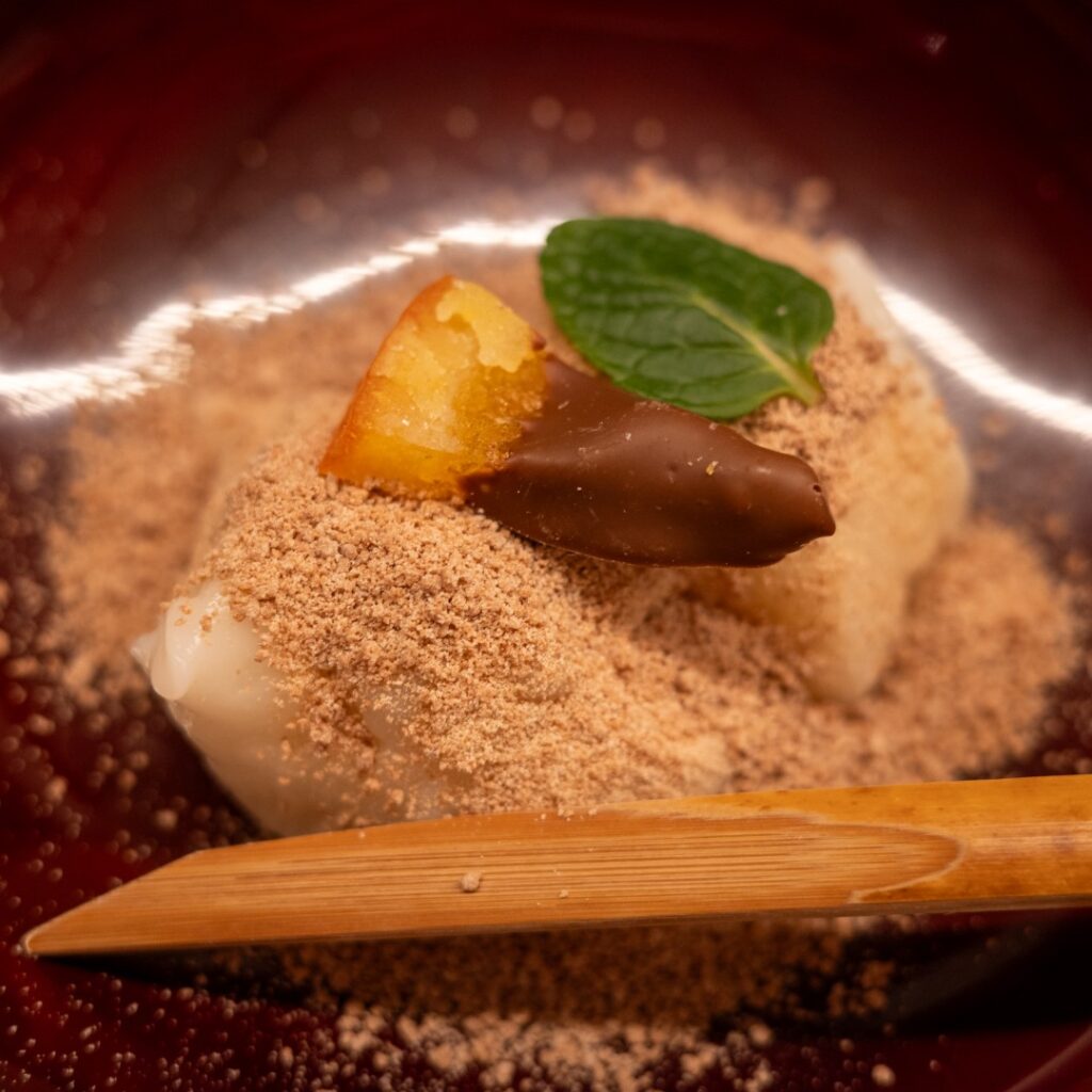 で、甘味が2つ。1つは古都華のいちごあめ。もう1つは吉野葛のデザートです。そういえばデザートの前にシェリー酒もいただきました。うーん香りがすごい。面白い体験でした。