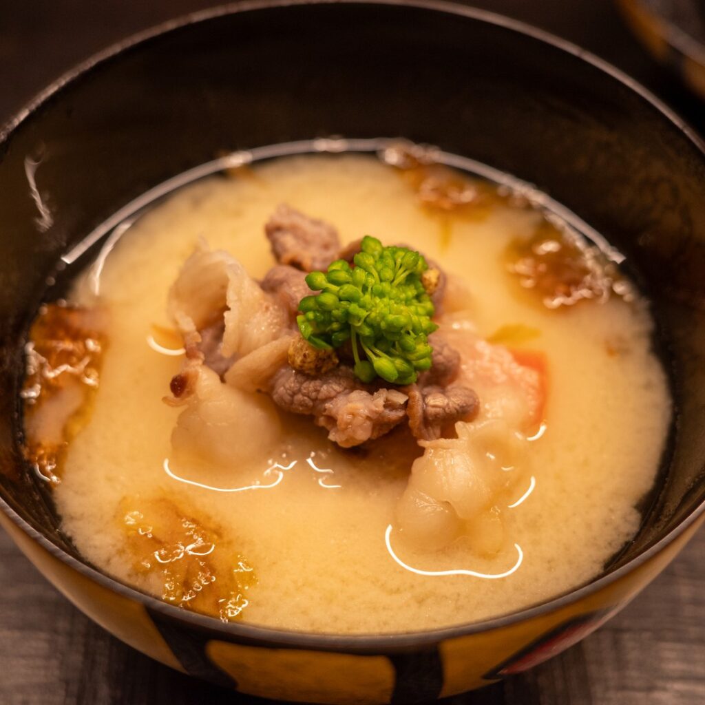 こちらはツキノワグマのお肉。下には奈良名産の味間いもが忍ばせてあります。意外と癖がないんですね、くまさん。おいも、とろとろですね。