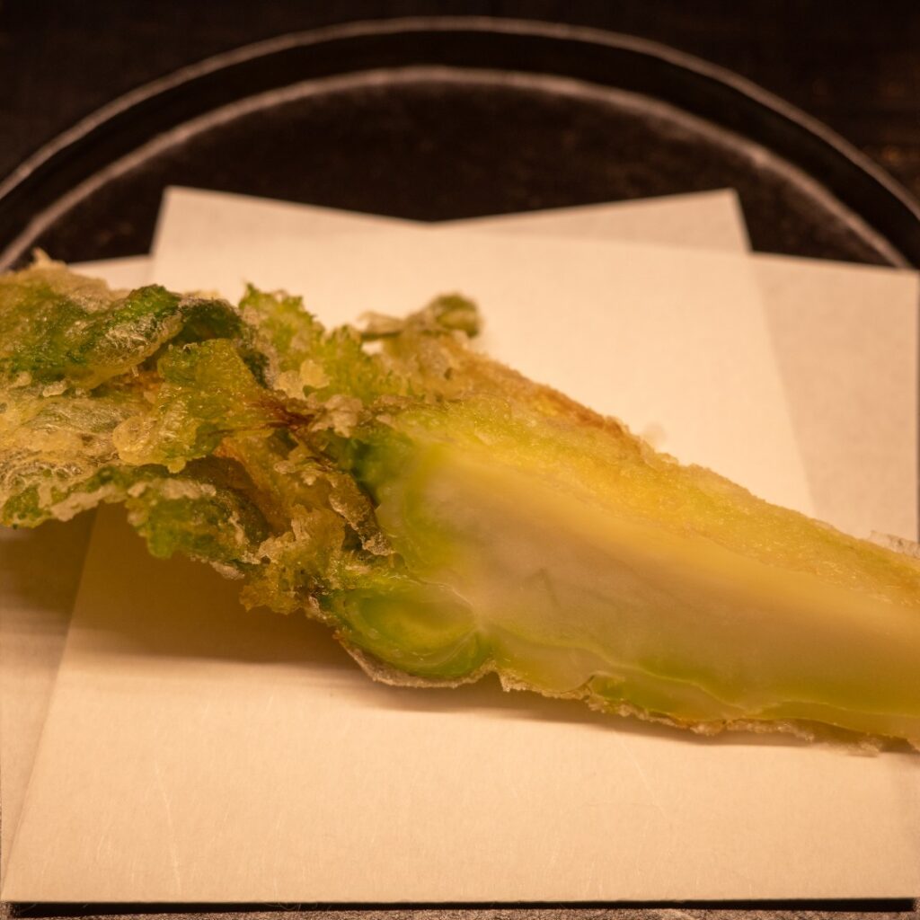 こちらは祝蕾(しゅくらい)の天ぷら。奈良に来て珍しい野菜だと思い、自分でも調理してみましたが、全然ちがう。。。天ぷらおいしい。。。