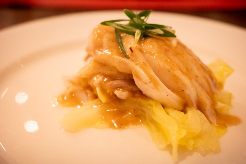 そしてエイとキャベツのシェリービネガーソース。エイってこんなに美味しく食べられるんですかー! 驚きの連続です。
