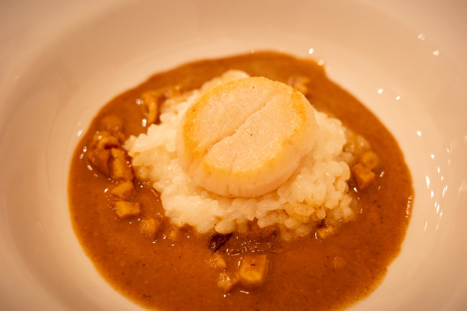 一枚目はホタテのソテーとリゾット セップ茸のソース。濃厚な旨味と香りに目玉が飛び出るかと思いました。