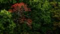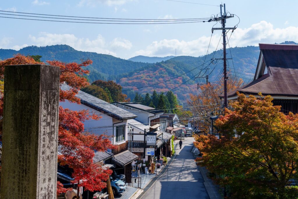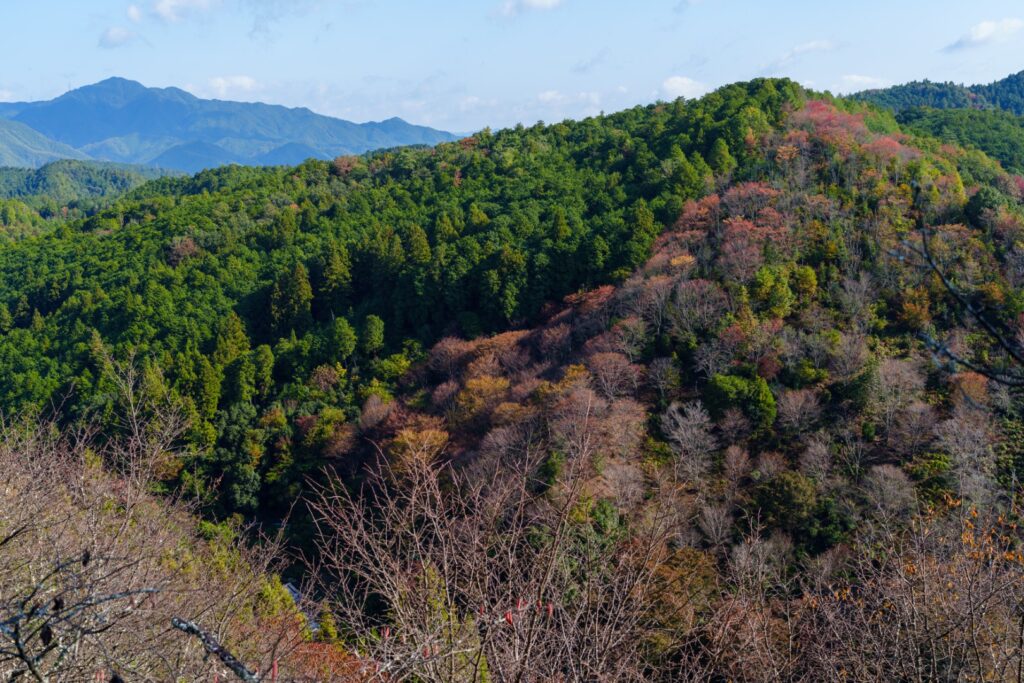 駐車場からちょっと歩くと下千本の景色が見えてきました。春はピンク色でしたが、秋は赤色で桜が山に模様を作ってますね。なるほど、こうなるのかぁー。