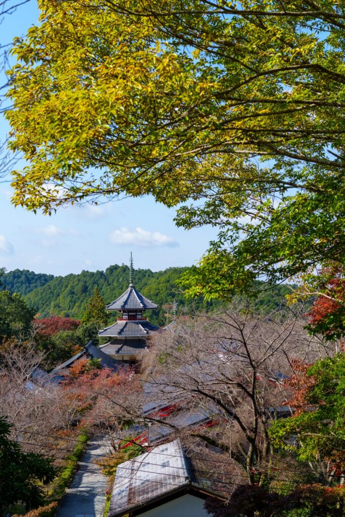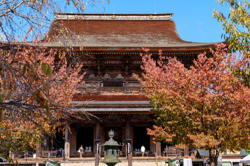 銅の鳥居ををくぐり、金峯山寺蔵王堂まで来ました。手前の桜がちょうど見頃を迎え、檜皮葺きの屋根と呼応するように、色を重ねていました。