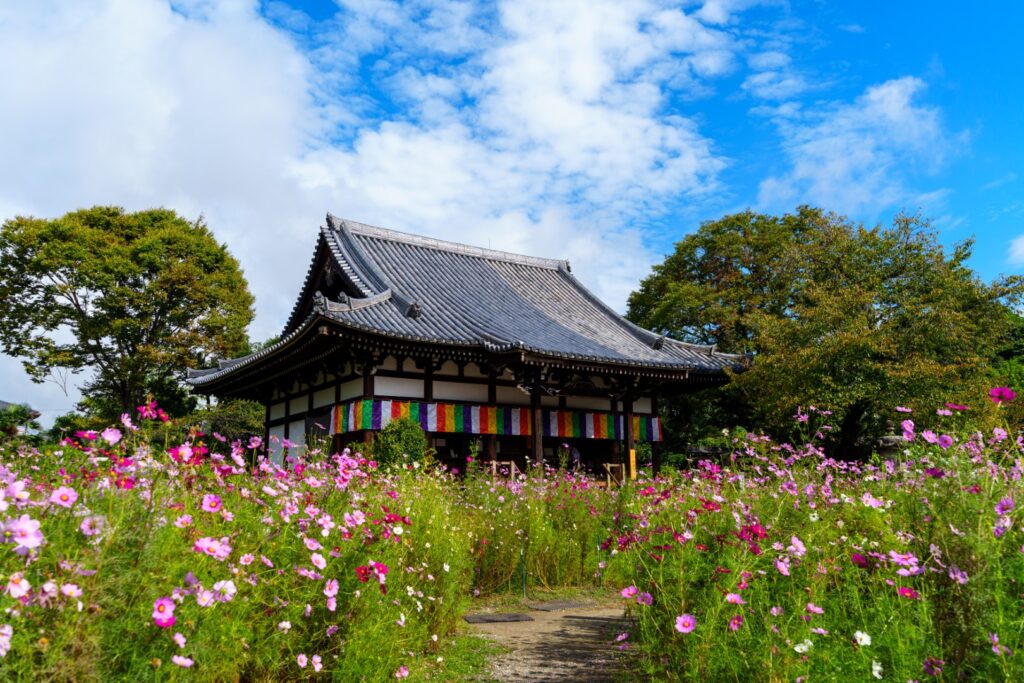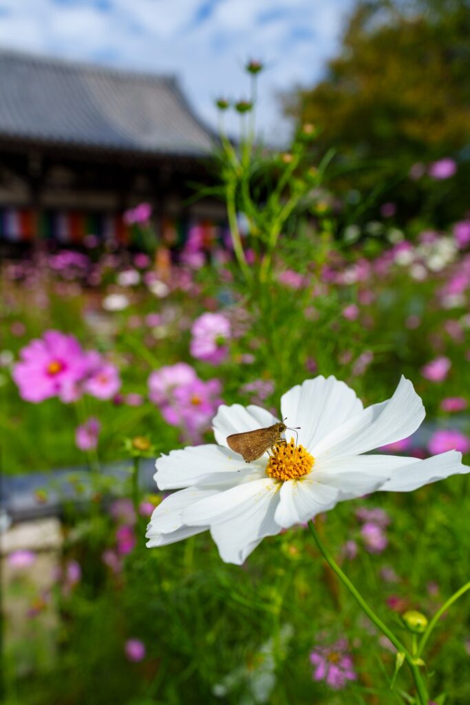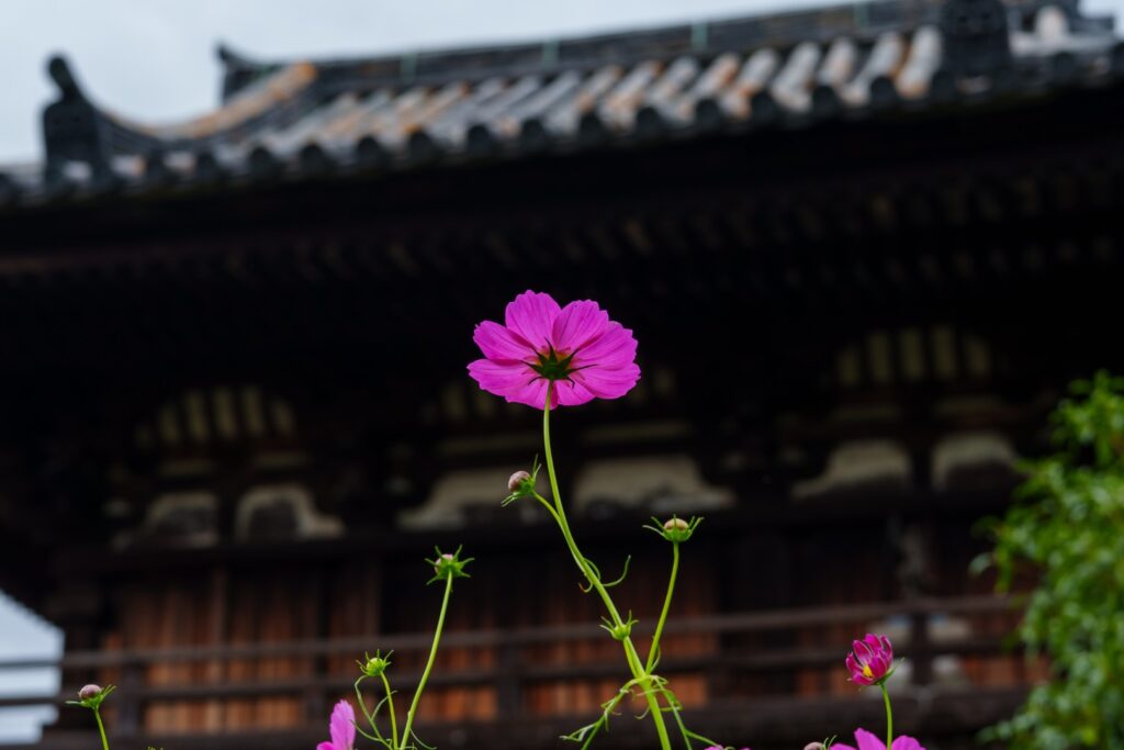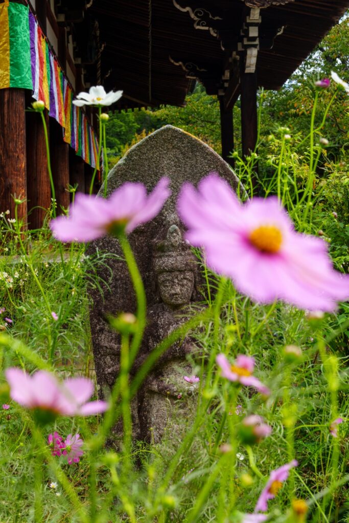拝観料700円を納めて境内に入ります。確かに満開ですね。背丈が高いコスモスのおかげで本堂が花に包まれているかのようです。