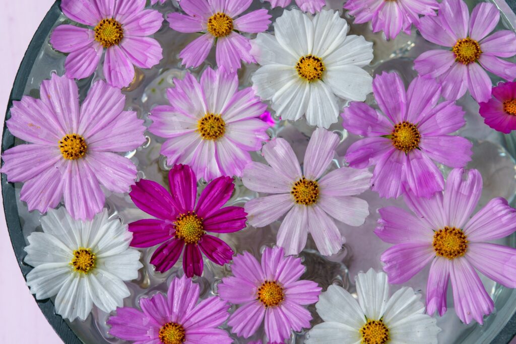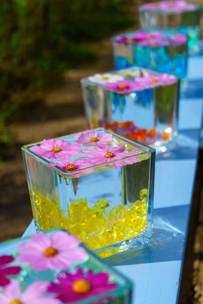 紫陽花の時と同様に(梅雨入り手前で、紫陽花を見に般若寺へ。 | ふぇるログ)、ガラス容器とコスモスを使って綺麗に飾り付けられておりました。こちらはコスモスグラスキューブ。