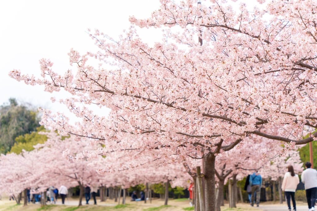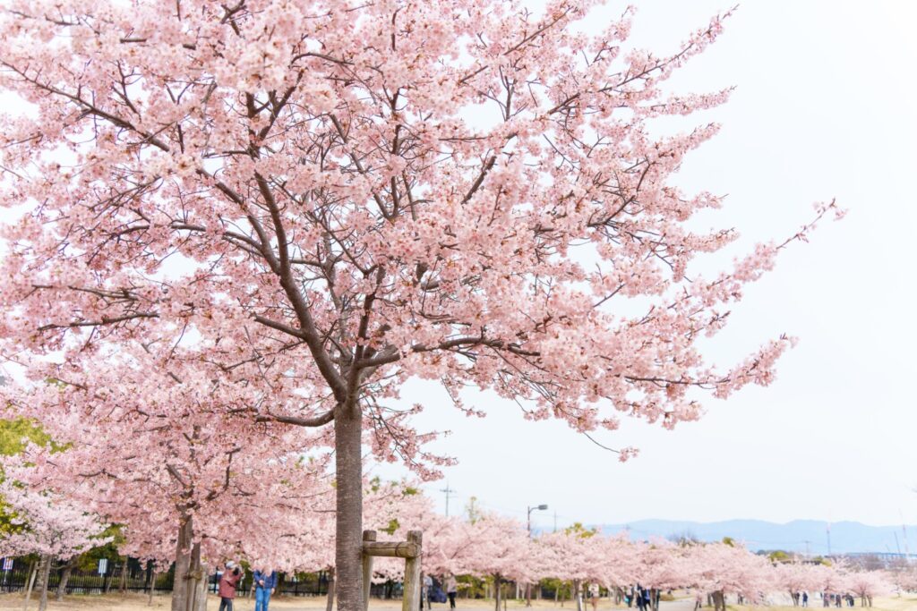 せっかくなので、満開と聞いた馬見丘陵公園の河津桜へ寄り道。南駐車場に愛車を停めると、そこは満開の河津桜が。多くの人で賑わっていました。