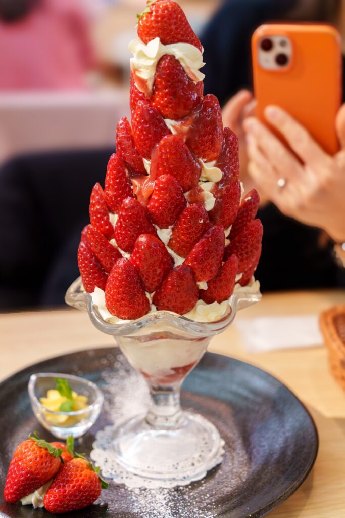 古都華を26粒使っているそうです。高さはなんと約30cm。二人で分けて食べましたが、もうはらパンパンです。お口直しにも古都華3粒。こんなに一気に苺を食べたのははじめてかも。。。とても美味しくいただきました。
