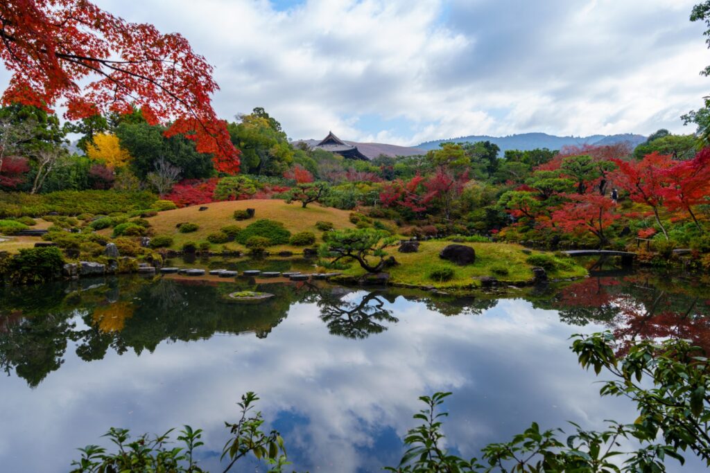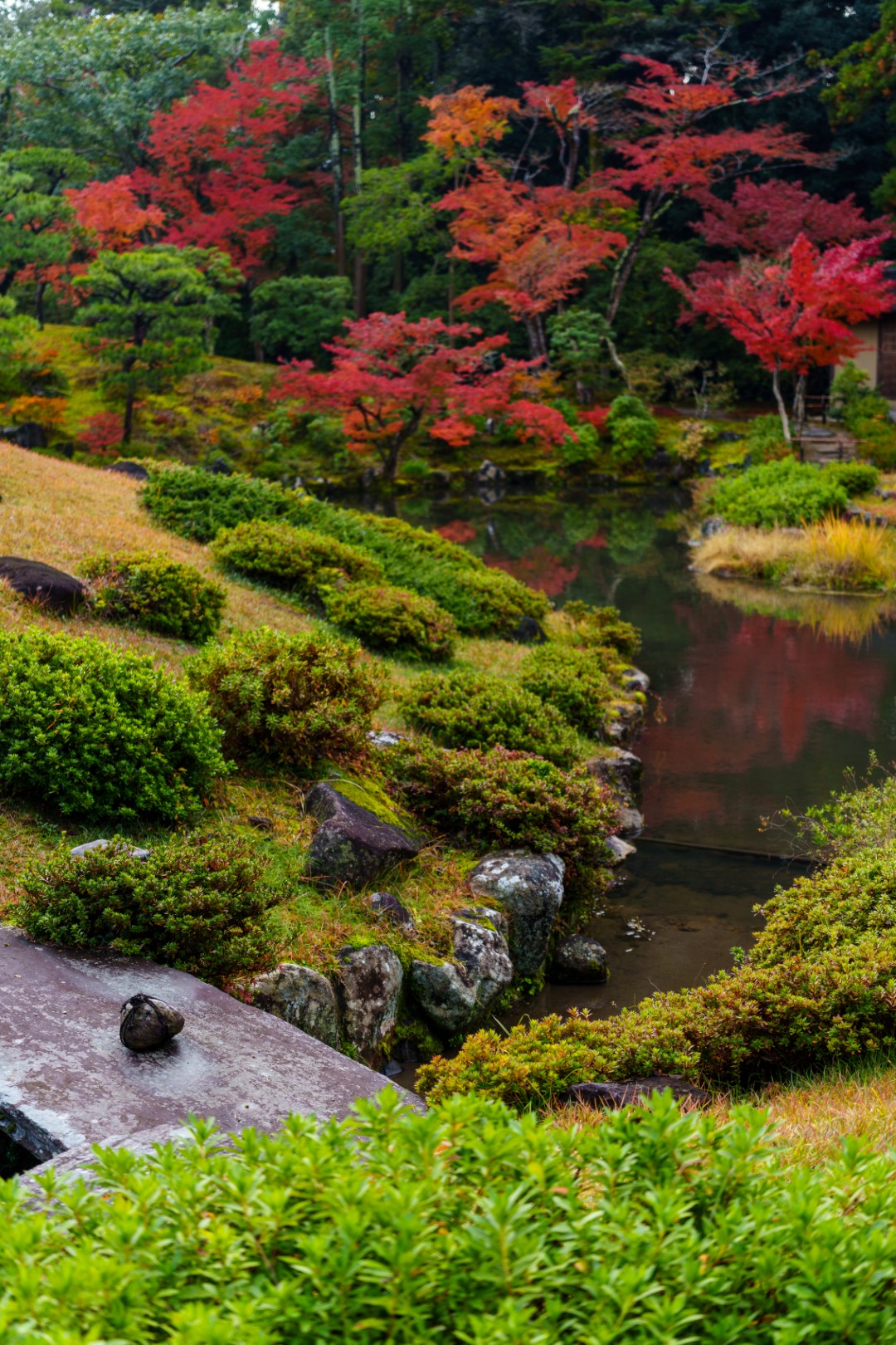 この日はガラス窓が印象的な氷心亭が改装中でした。が、お庭は美しく、ぽつぽつとバランスよく植えられたもみじが池にも浮かび上がっておりました。