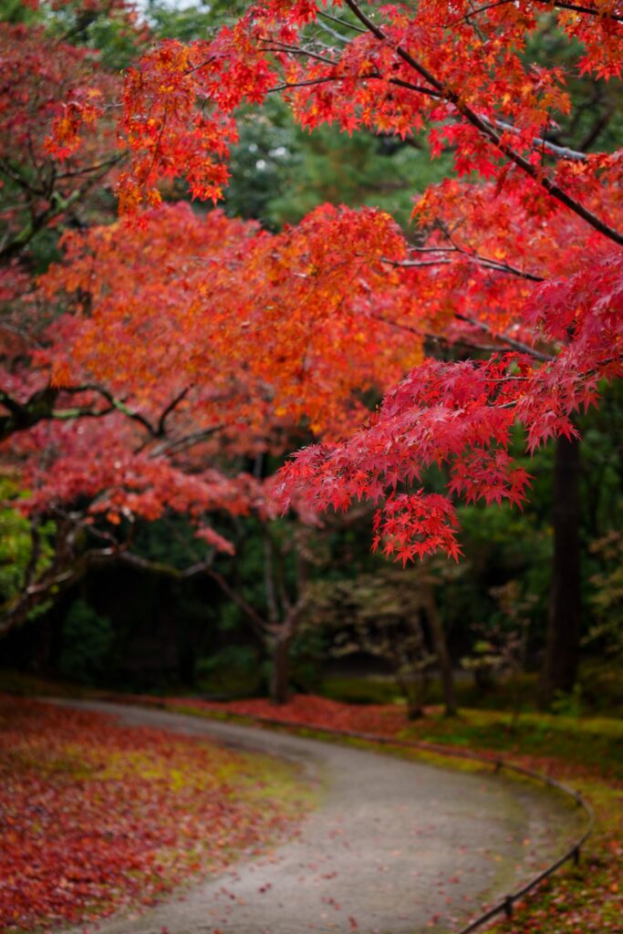 真っ赤なもみじがたくさん生えた渓谷のように見えますが、これは真っ赤なドウダンツツジと小さい水路です。面白いですよね。