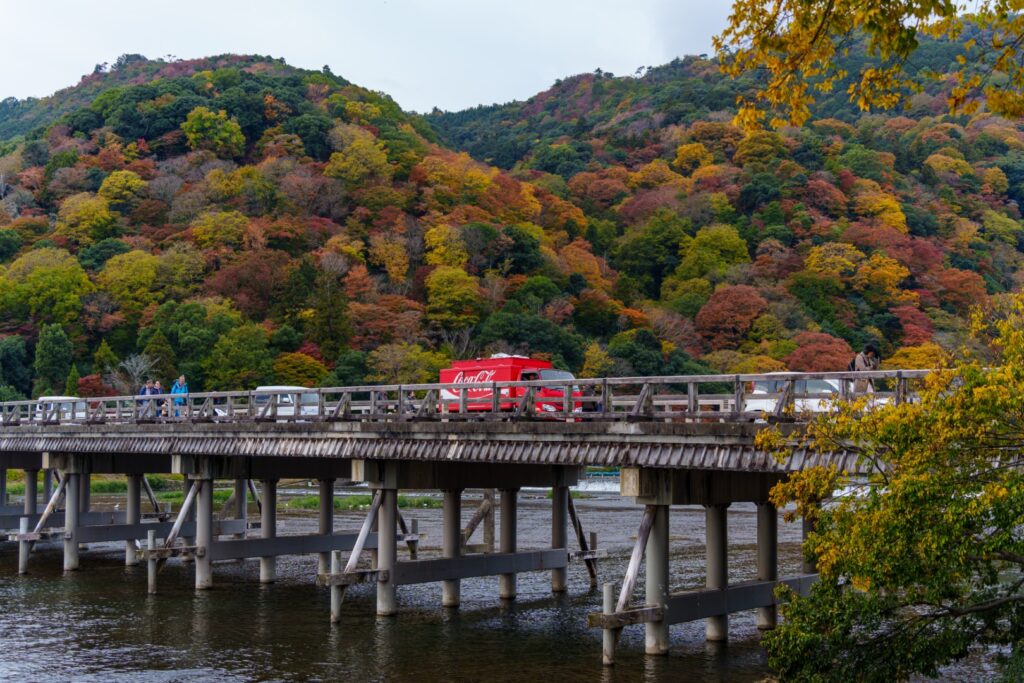 知らなかったんですが、渡月橋って、車も渡れるんですね。。。ちょうど紅葉した小さめのトラックが渡っておりました。ありがたや。