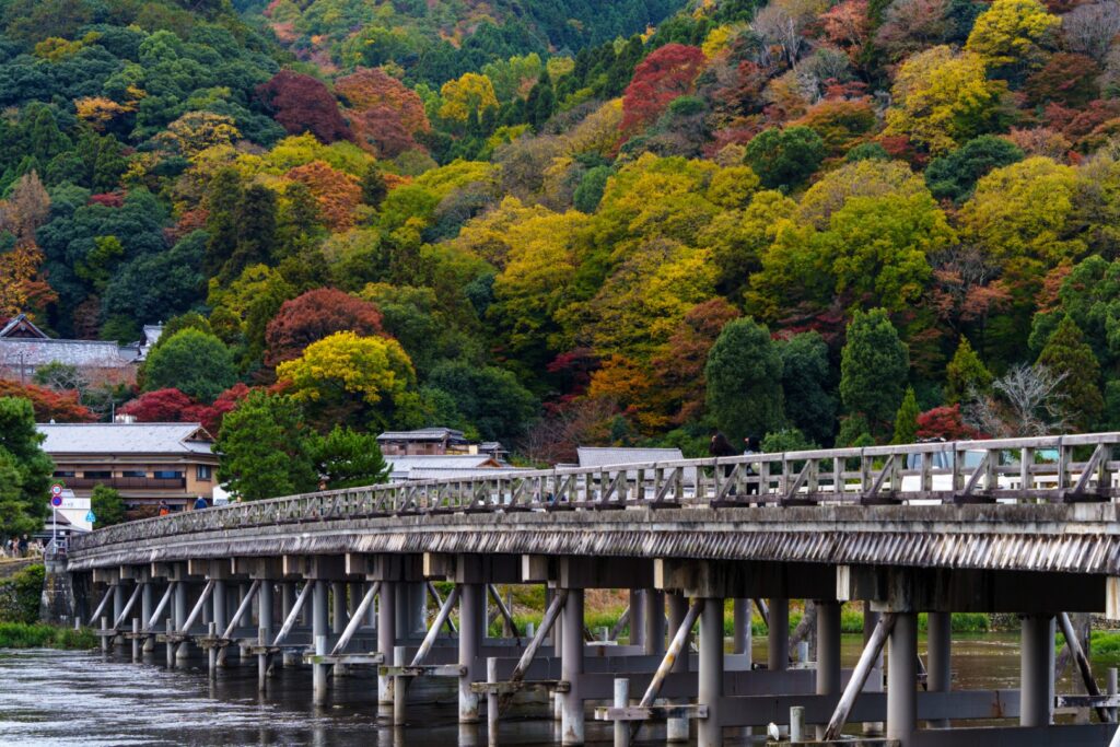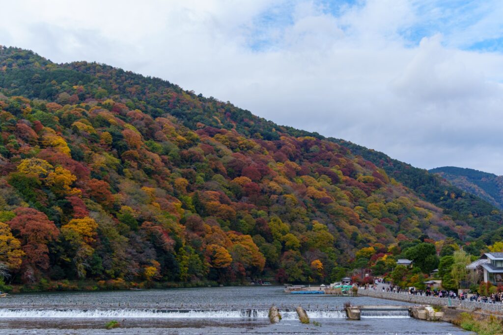 渡月橋の上から眺める嵐山は、赤・橙・黄・緑に彩られ、山全体が一つの大きなパレットの様でした。