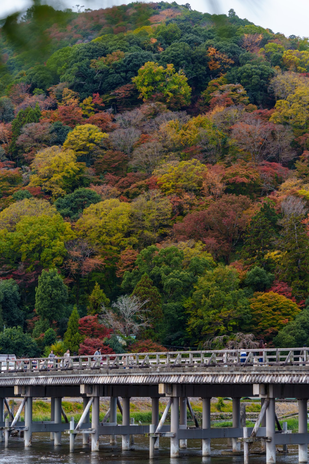 渡月橋の上から眺める嵐山は、赤・橙・黄・緑に彩られ、山全体が一つの大きなパレットの様でした。