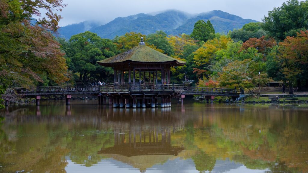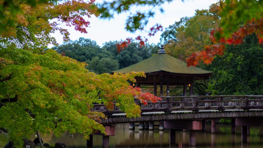 着きました。おー。浮見堂をバックに、もみじが緑から黄色、そして赤へと移り変わる様子が味わい深い。ありがたや。