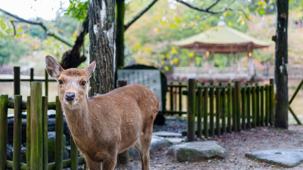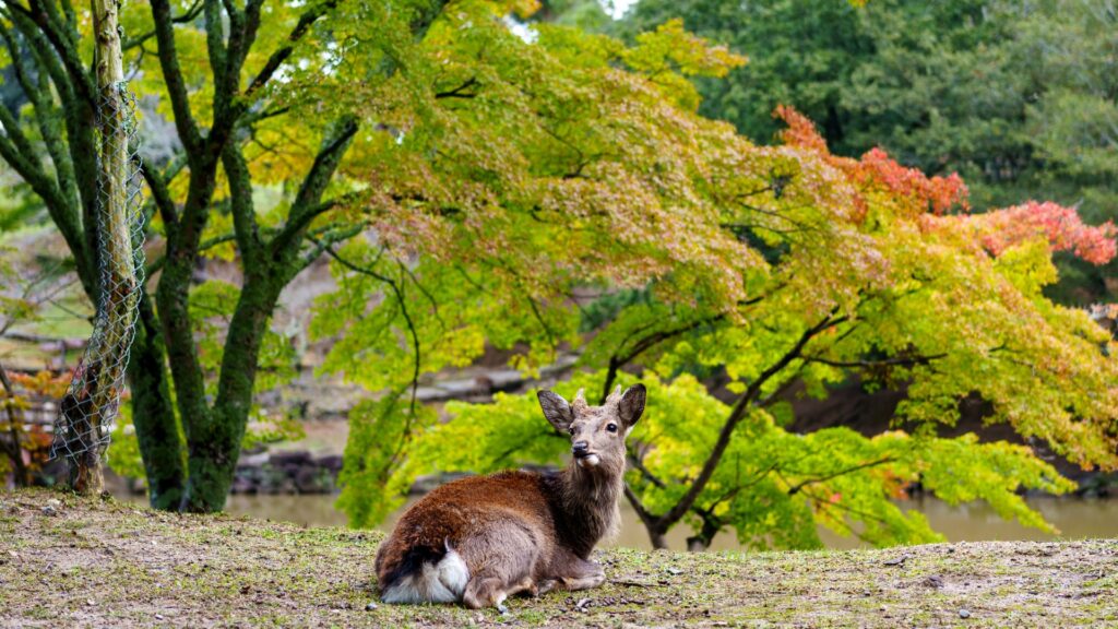 浮見堂の裏手はもみじがいっぱいです。良いところだろ。と雄鹿がどっしり座っておりました。