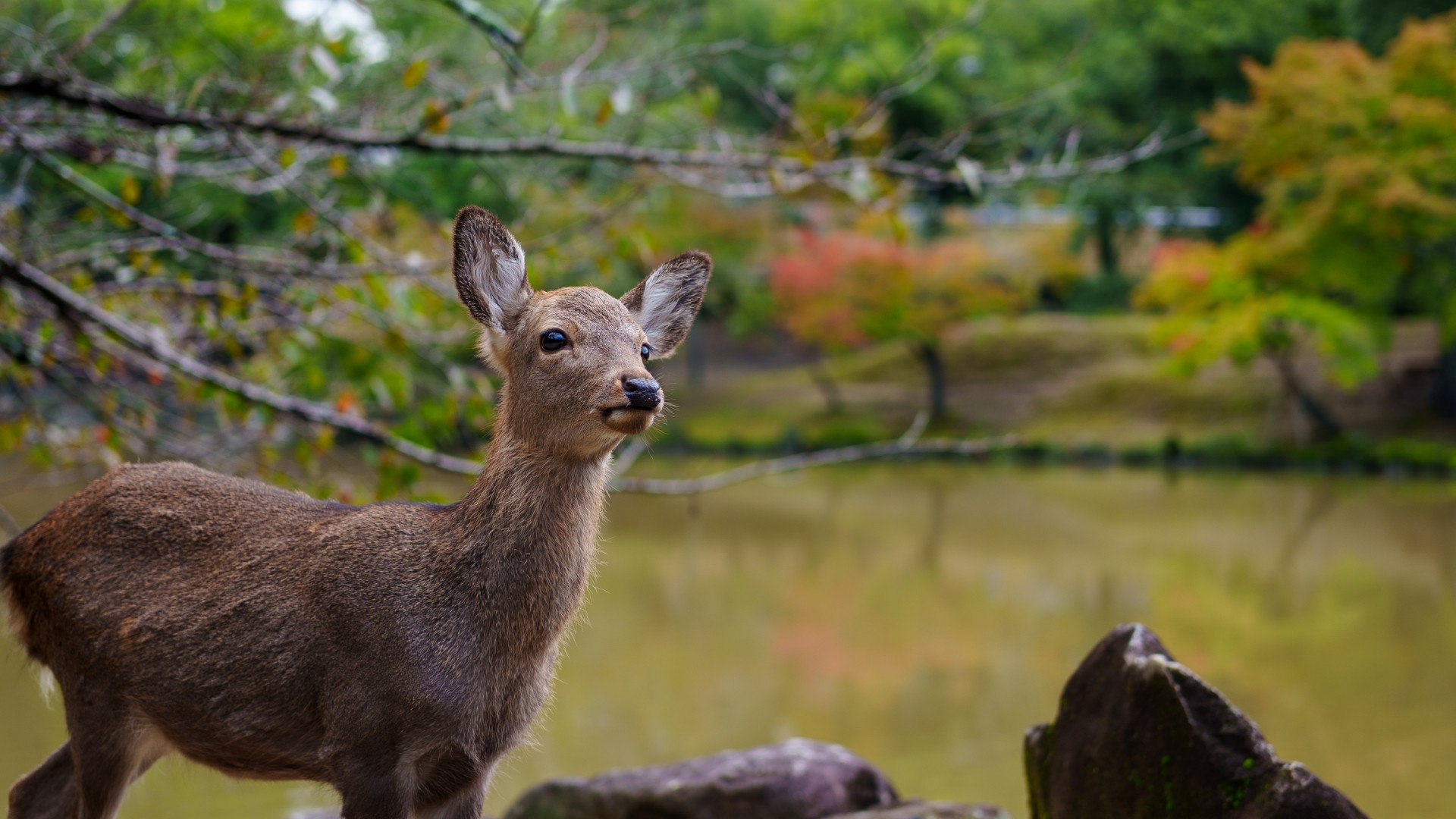 浮見堂の裏手はもみじがいっぱいです。良いところだろ。と雄鹿がどっしり座っておりました。