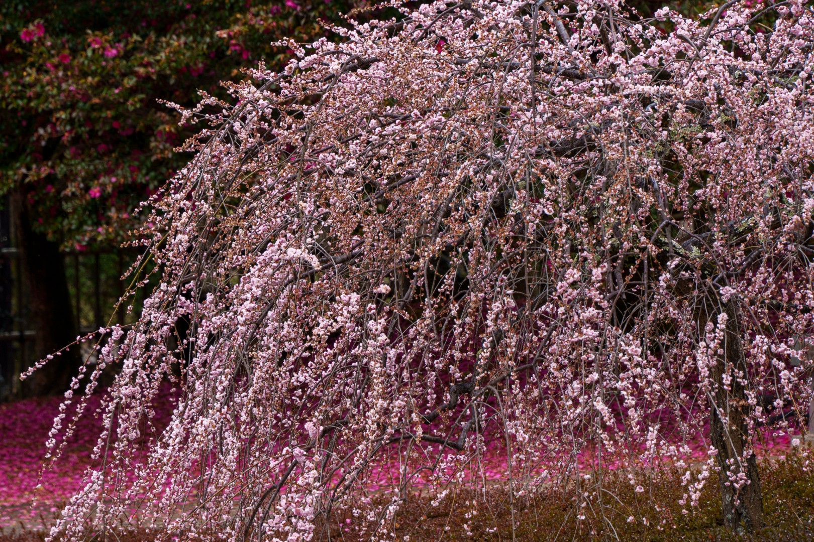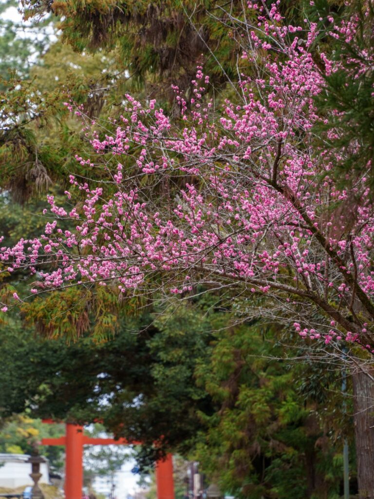 春日大社一之鳥居をくぐり、しばらく歩いたところに梅の木が一本だけあります。振り返って一之鳥居とご一緒に。