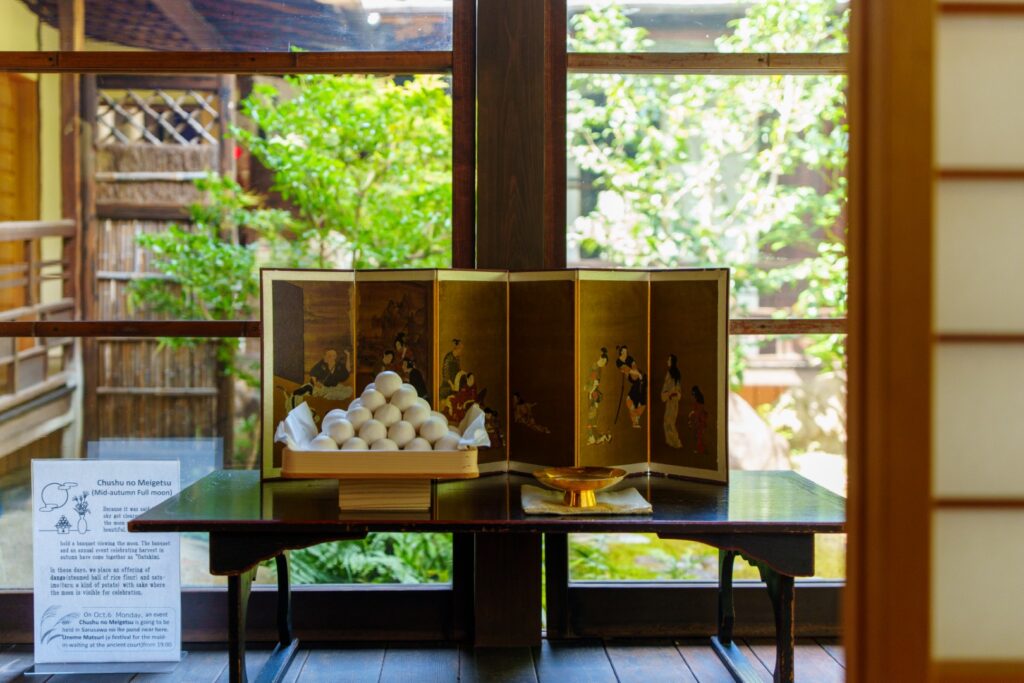 中秋の名月で、月見だんごの飾りがありました。海外の方にも人気の様で、しっかり英語で説明がございました。素晴らしい。