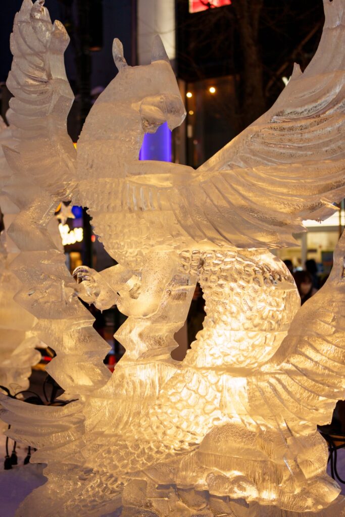 細かい細工がライトに透けて雪像とは異なる面白さがありますね。さまざまな趣の氷像が60体も展示されていました。