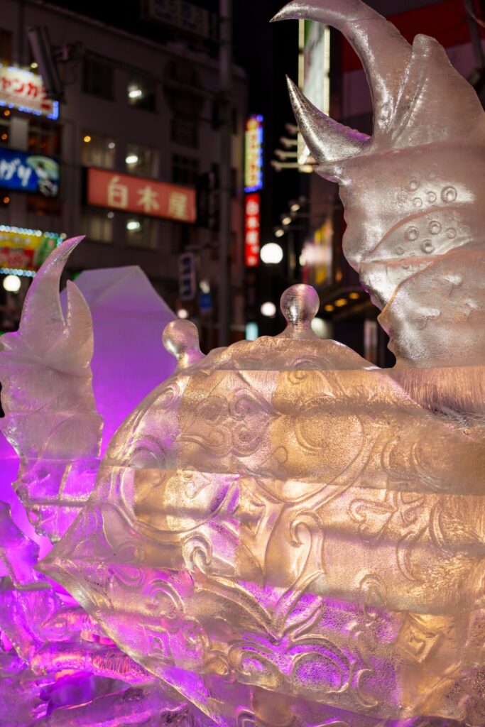 ステンドグラス美術館を楽しんだ後、再び雪道を歩いてJR小樽駅へ。電車に飛び乗り札幌に戻りました。宿でちょっと休んだ後、晩ごはんを食べにすすきの方面へ向かいます。すすきのも雪まつりの会場になっており、こちらは大通公園の雪像とは異なり、氷像が飾られています。