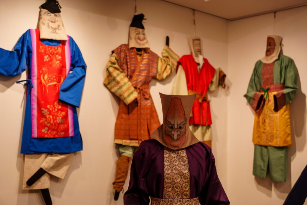 こちらは日本に伝わった最古級の仮面舞台芸能である伎楽(ぎかく)の衣装。お面の代わりの絵が味わい深い。
