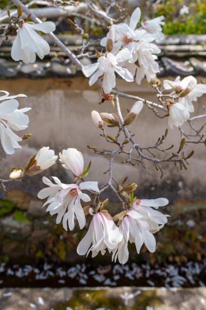 古びた土塀の前に、散り際のコブシ。いやー、好みです。