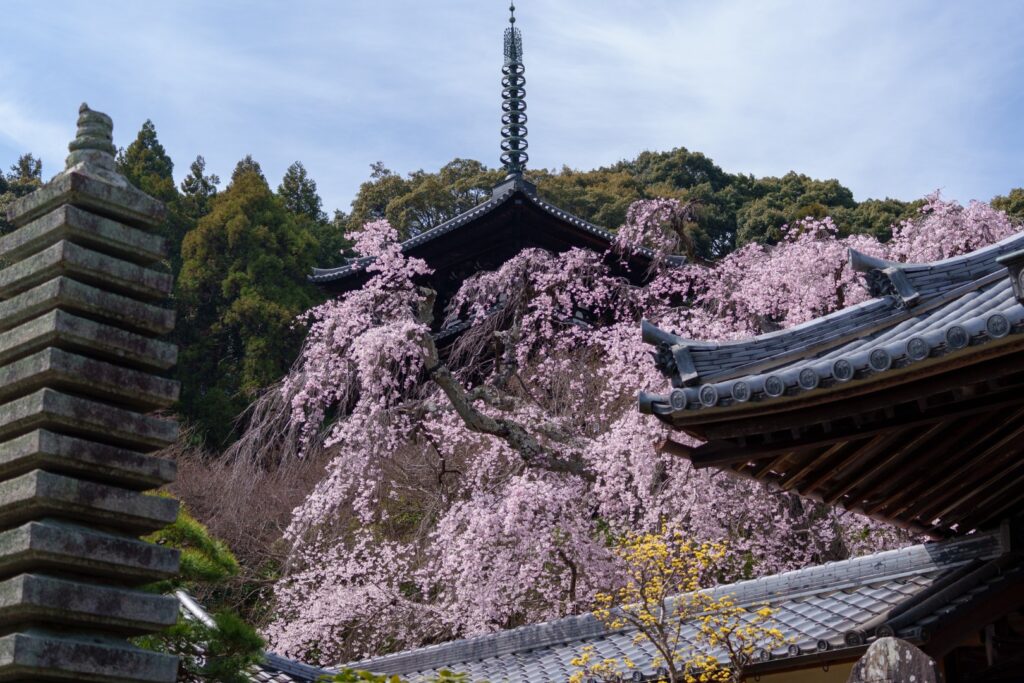 奥院を出て、護念院へ。こちらにも立派な枝垂れ桜が満開で迎えてくれました。西塔との共演が良い趣です。