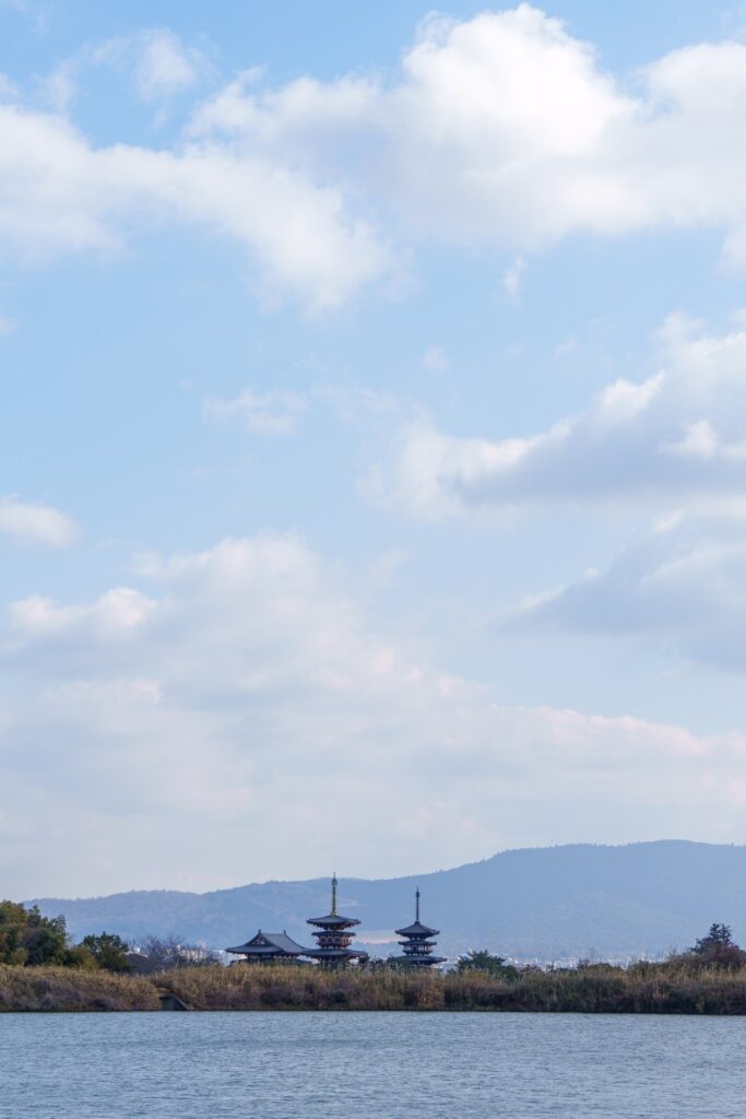 さて、今日の目的の風景は大池越しの薬師寺。双塔と奈良の町並み、若草山を望めます。一枚目の写真の角度だと東大寺の大仏殿も写ってますね。