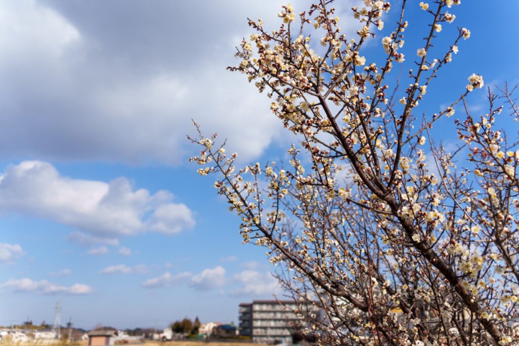 梅越しに見えて参りました。東塔と西塔(左下に)。双塔が特徴です。