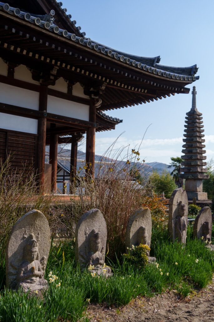 三十三観音石造。水仙の控えめな感じが古刹の趣を増しております。奥に若草山が見えますね。沁みる景色です。