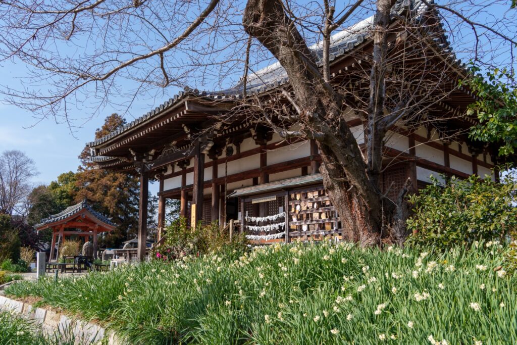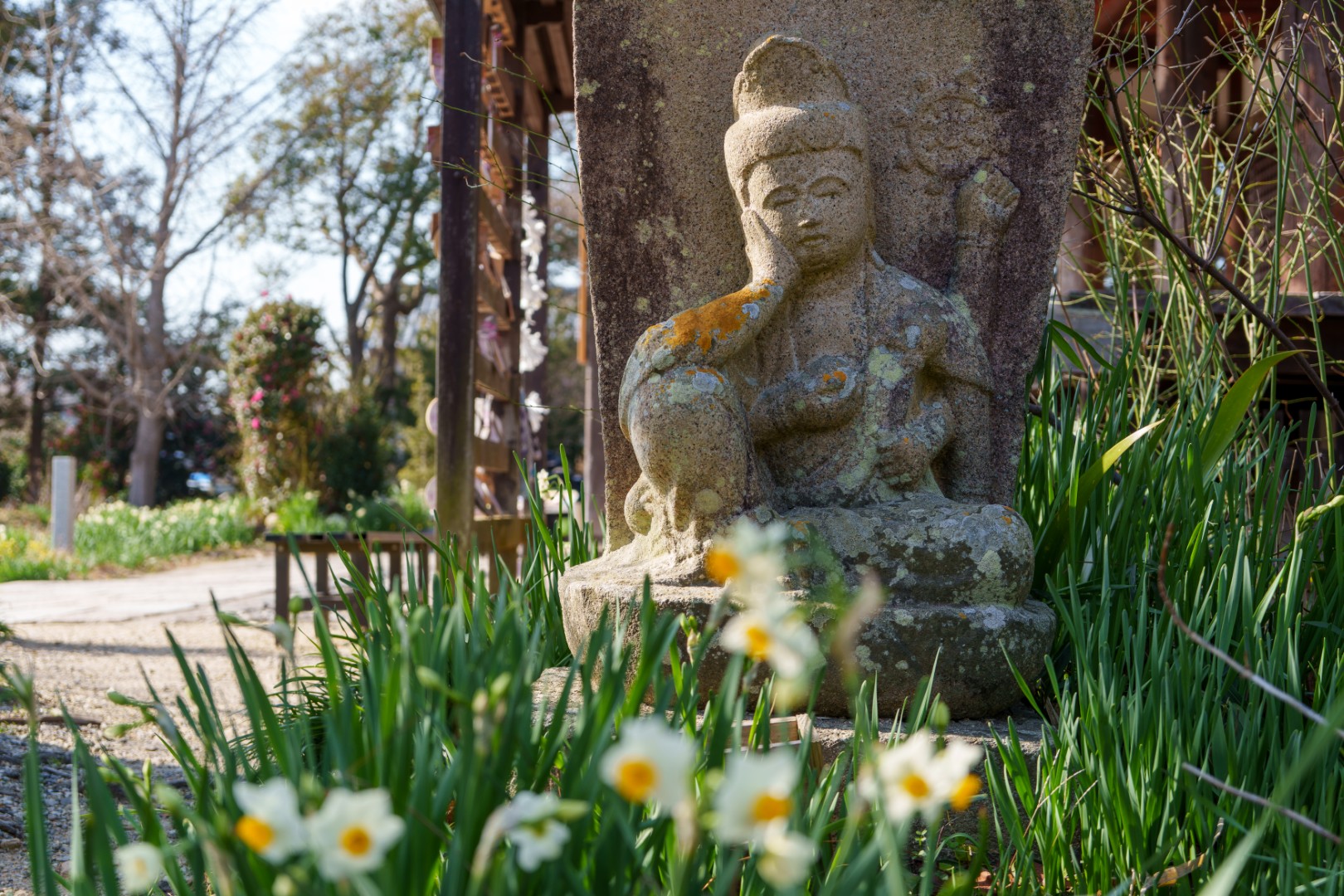 これまであじさい、秋桜とみてきましたが、それらに比べると水仙は背丈が低く、境内の様子がよくみて取れるのも新鮮でした。