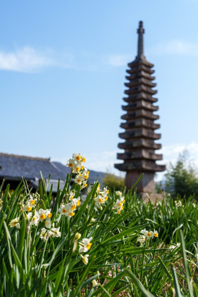 さて、拝観料500円を納めまして境内へ。水仙が可愛らしく咲いておりました。十三重石宝塔と背を比べているよう。
