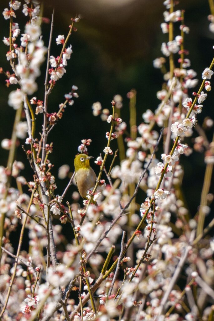 人の姿はありませんが、整備はしっかりされており、テラスもありました。そこでお茶を飲み休憩していると、目の前の梅にメジロがやってきました。ありがたや。