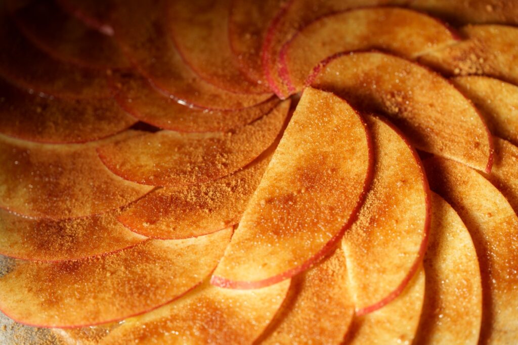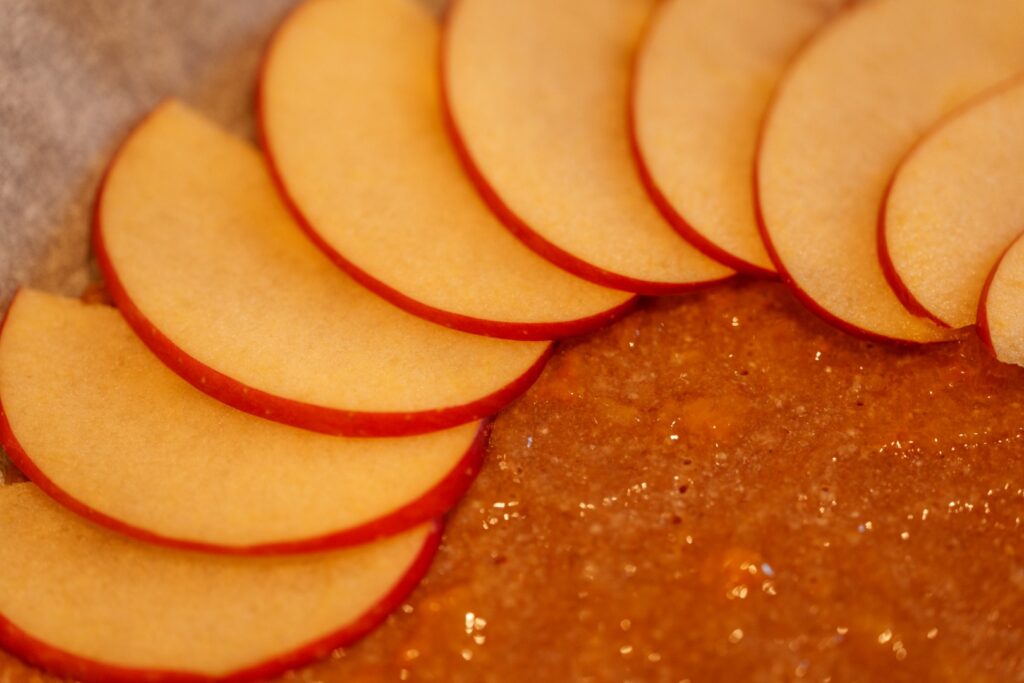 なにやら林檎が薄くスライスされ、生地の上に並べられております。