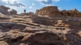 歩いていると丘の下まで来ました。そこから見上げてみると赤白ピンクの帯が空まで伸びているよう。