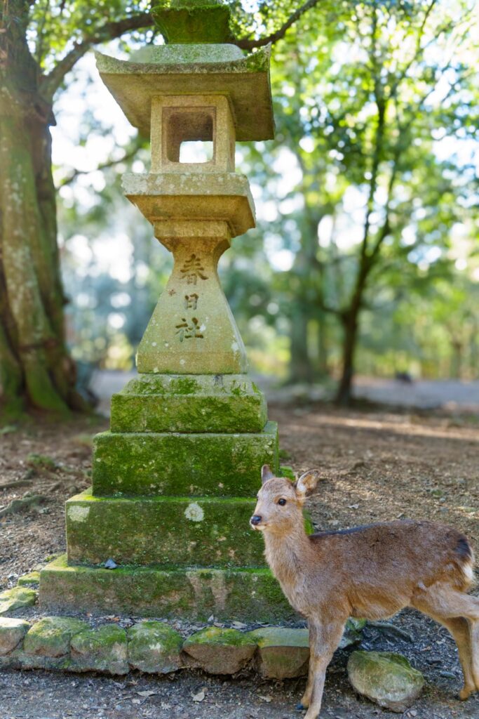 一の鳥居をくぐりまして、飛火野を通り過ぎると、春日大社の灯篭と小鹿さん。みぎがわつうこうでおねがいしまーす。と道案内です。