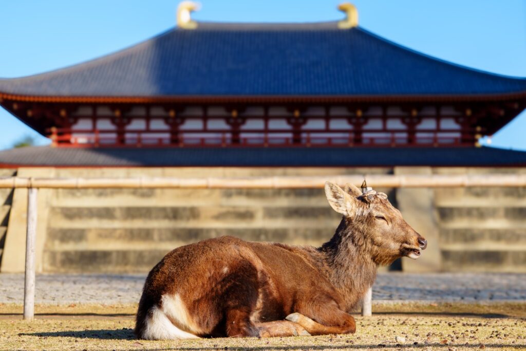 三条通りをまっすぐ春日大社に向かって進むと、中金堂をバックに鹿さんがドカッと座って日向ぼっこをしておりました。今年もよろしくお願いいたします。
