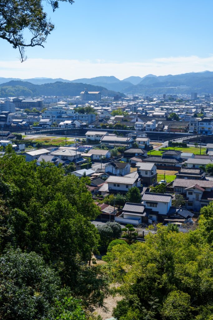 今日はそちらは抜きで、豆田町を楽しみます。豆田北駐車場に愛車を停めました。近くに城跡があり、そちらから豆田町を見渡せます。ごらんのように盆地です。この日は10月なのに30℃を超えておりました。