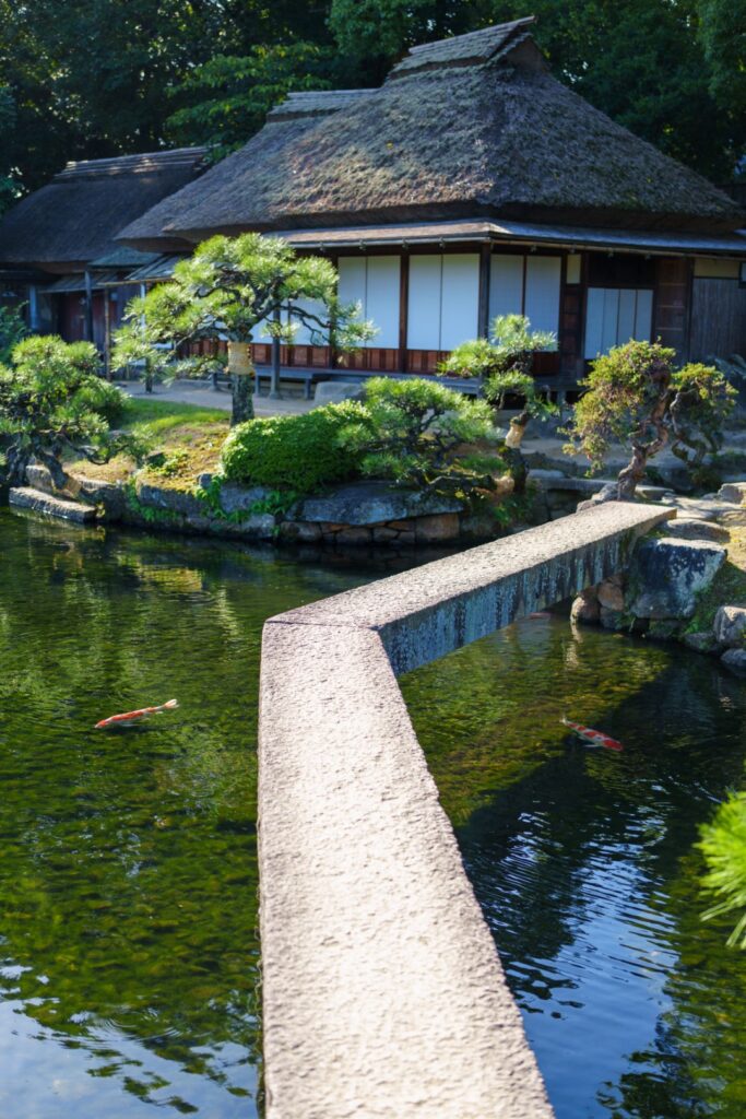 こちらは廉池軒。くの字の橋と綺麗な池に錦鯉。見ごたえのある設計です。