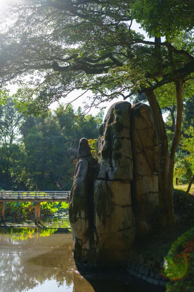 岡山後楽園公式HP、後楽園の歩き方にある”じっくりコース”で広い園内を巡ります。こちらは大立石。でっかい石ですが、良く見ると線がたくさん走っています。運ぶために91個に割られ、再び組み立てられたそうです(看板参照)。石もそんなことになるとは思わなかったでしょうね。