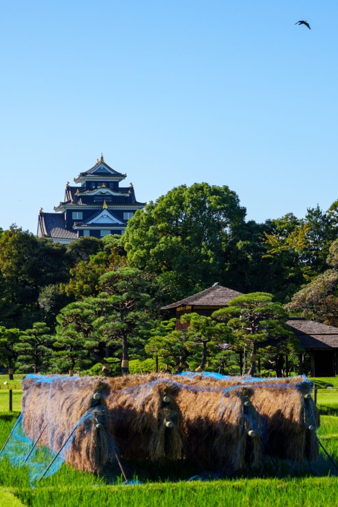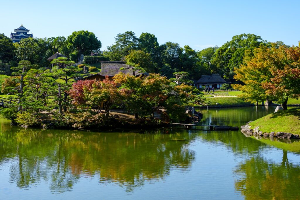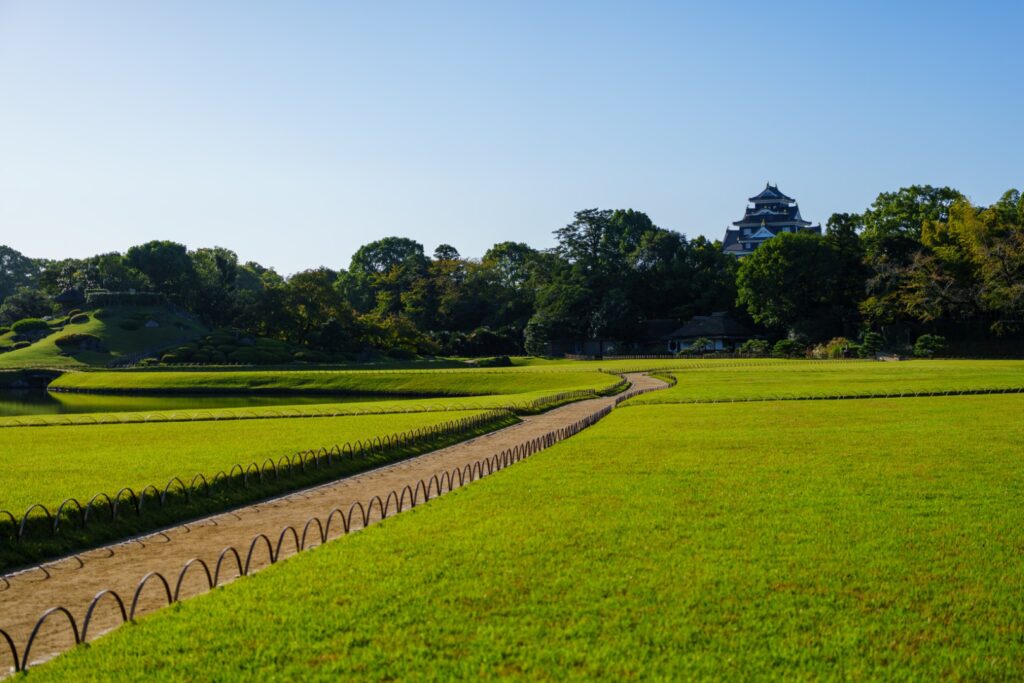 入園料500円を納めて園内に入ると、綺麗に刈り込まれた広い芝のお庭が目に飛び込んできます。奥には岡山城も見えますね。